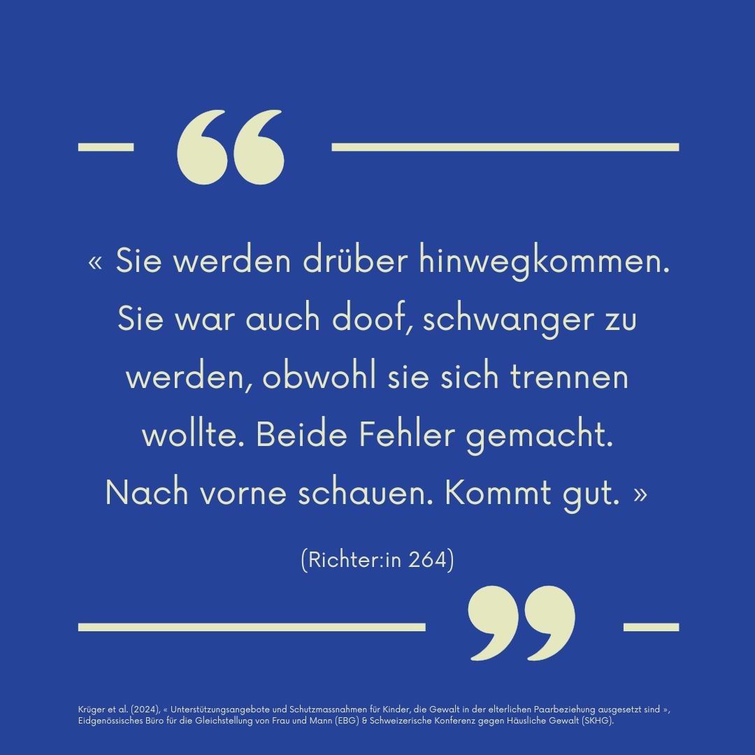 Dieser Satz stammt aus einer 2024 veröffentlichten Studie (Teil II) — « Unterstützungsangebote und Schutzmassnahmen für Kinder, die Gewalt in der elterlichen Paarbeziehung ausgesetzt sind » —, die bei Fachpersonen der Justiz in der Schweiz durchgeführt wurde.